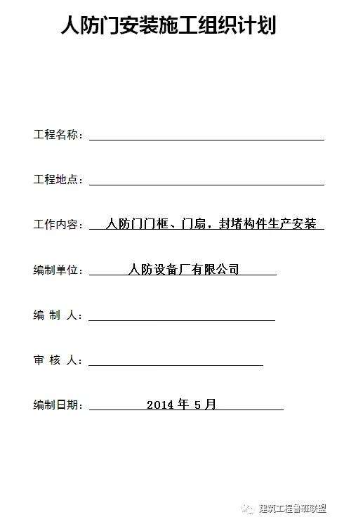 (一)編制施工組織計劃施工組織計劃是做好人防門安裝工作的行動指南,一般由人防門生產安裝企業安裝負責人根據工程實際情況和施工規范要求,組織安裝班組進行編寫,報監理機構審批后組織實施。(參見附件:《人防門安裝施工組織計劃》)。