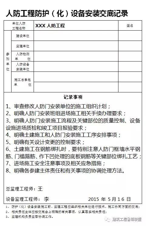 安裝交底是人防門安裝準備階段不可缺少的基礎性工作,一般由監理機構組織實施。建設、設計,土建施工、檢測、人防門安裝班組等單位共同參加,并做好記錄(參見附件:《人防工程防護(化)設備安裝交底記錄》)。
