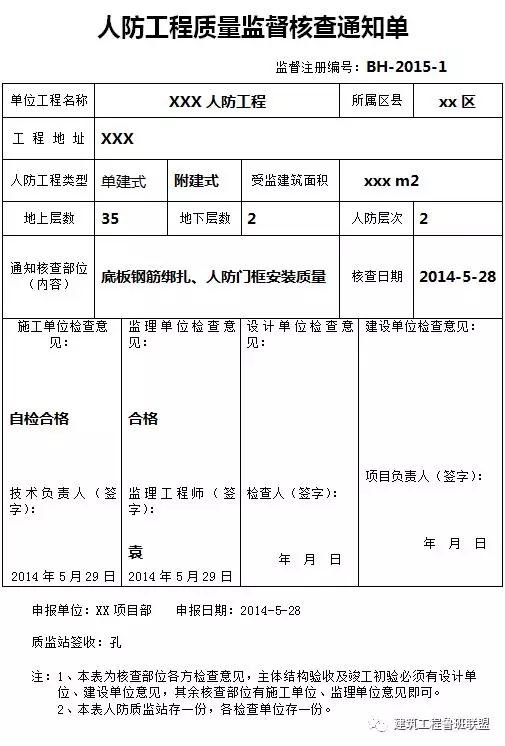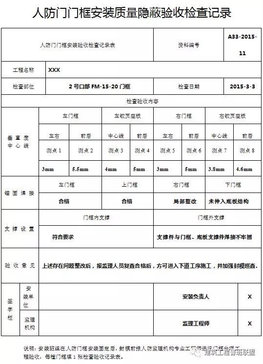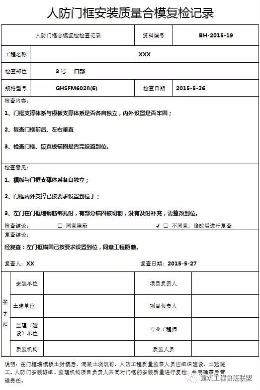 7、合模檢:在門框墻模板封模后,混凝土澆灌前,質量監督機構應組織監理人員、人防門安裝人員及土建施工單位項目經理,共同對門框安裝、固定質量進行分項交接驗收,并落實事后監管責任(參見附件:《人防門安裝質量合模復檢記錄》)。