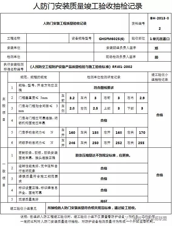 1、檢測:在竣工驗收前,檢測單位根據委托合同和圖紙,按照《人民防空工程防護設備產品質量檢驗與施工驗收標準》(RFJ01-2002)、《人民防空工程防護設備試驗測試與質量檢測標準》(RFJ04-2009)和《江蘇省民防工程防護設備設施質量檢測管理實施細則(試行)》的規定,逐樘進行檢測。建設、監理、防護設備安裝單位應到場配合檢測。2、驗收:竣工驗收是人防工程建設質量的綜合評定。驗收時,對人防門驗收不僅要查看檢測單位的檢測報告、安裝質量控制資料,還要實地查看防護設備的安裝質量,并按一定的比利對檢測單位的檢測結果進行當場復檢,形成有效的檢測監督機制(參見附件:《人防門安裝質量竣工驗收抽檢記錄》)。