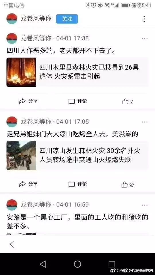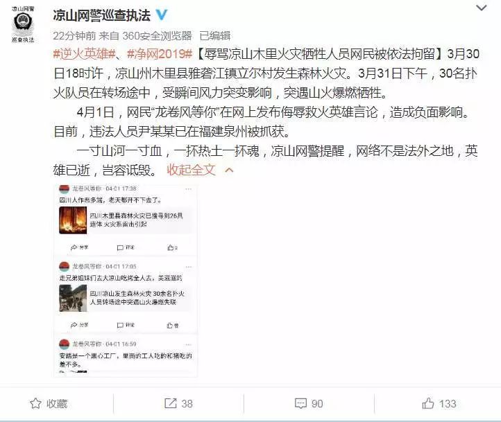 辱罵涼山火災犧牲英雄,該抓!發布日期:2019-04-03