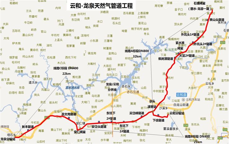 云和-龍泉天然氣管道工程起于擬建麗水-龍游天然氣管道一期工程的石塘清管站,經云和縣石塘鎮、緊水灘鎮、浮云街道、鳳凰山街道、白龍山街道、嵩頭鎮,龍泉市安仁鎮、塔石街道,終于龍泉分輸站,線路長度約74.05KM,設計壓力6.3MPa。