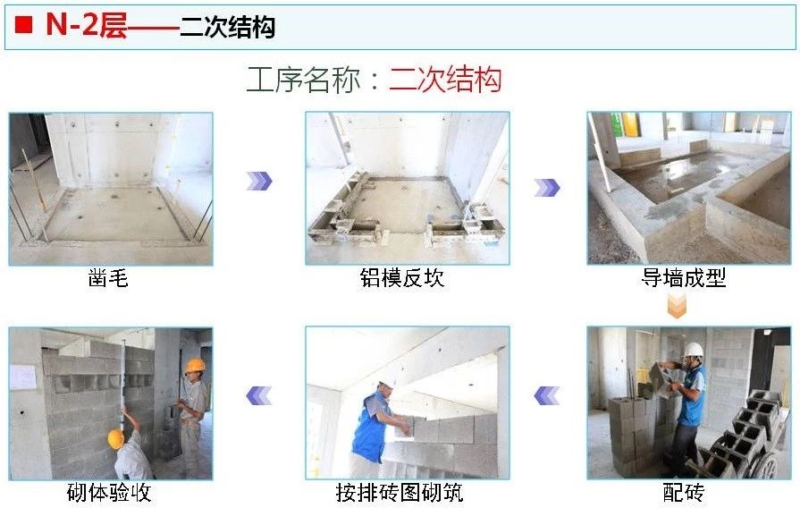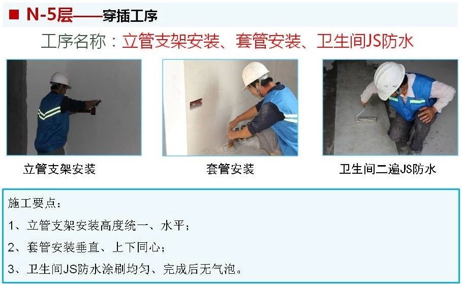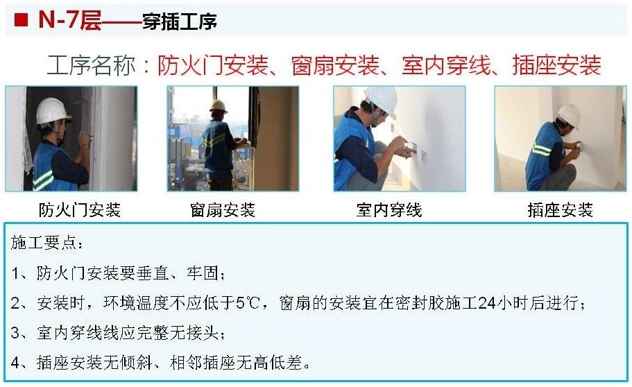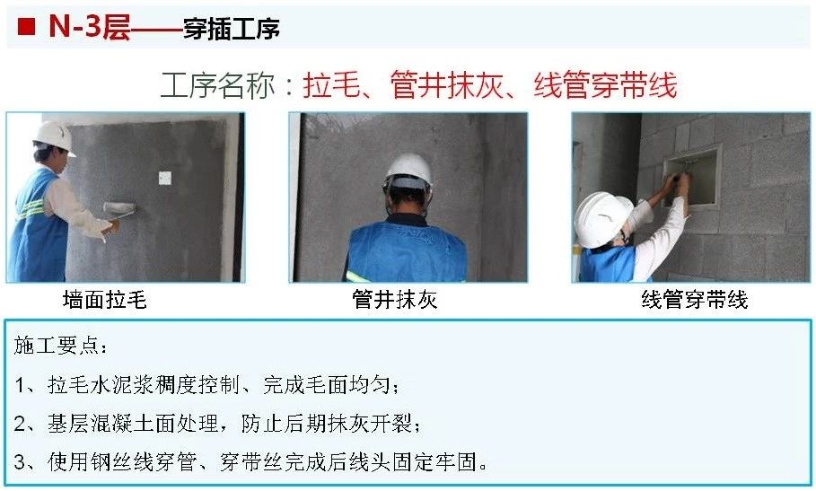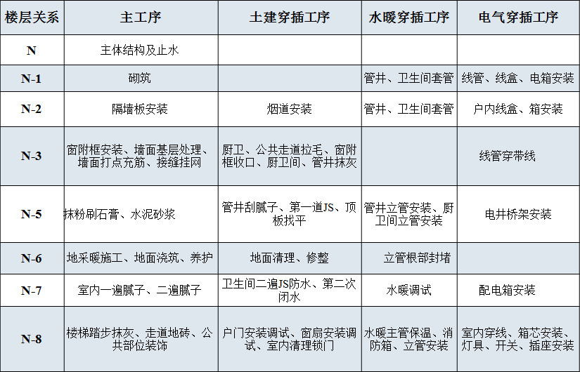 ? 大穿插施工是將每棟樓施工過程由上到下分為N、N-1、N-2、……N-8層,分主體結(jié)構(gòu)、二次結(jié)構(gòu)、基層處理及打點(diǎn)沖筋、抹灰、地采暖及地面施工、膩?zhàn)邮┕ぁ⒏鳂?gòu)件及設(shè)施安裝交付7道主工序,每道主工序均按照6天(常規(guī)主體施工大約為6天/層)一層等節(jié)奏流水,并分土建、水暖、電氣專業(yè)配合穿插工序施工。