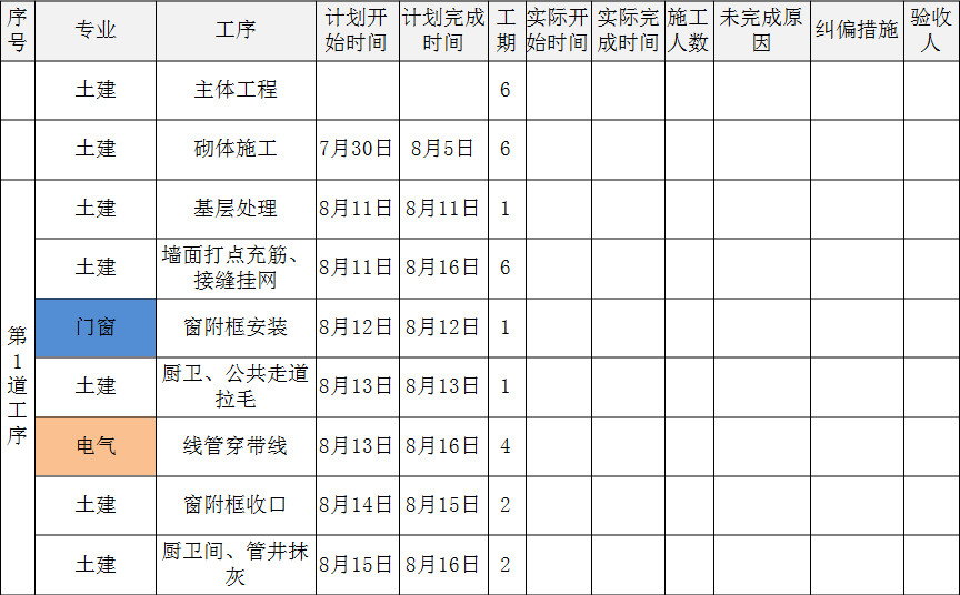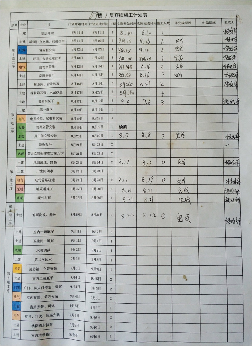 ? 在施工過程中,每天按計(jì)劃完成工作任務(wù),每天記錄實(shí)際開始時(shí)間、實(shí)際完成時(shí)間、施工人數(shù)、未完成原因、糾偏措施、驗(yàn)收人,確保按組織計(jì)劃完成施工任務(wù)。