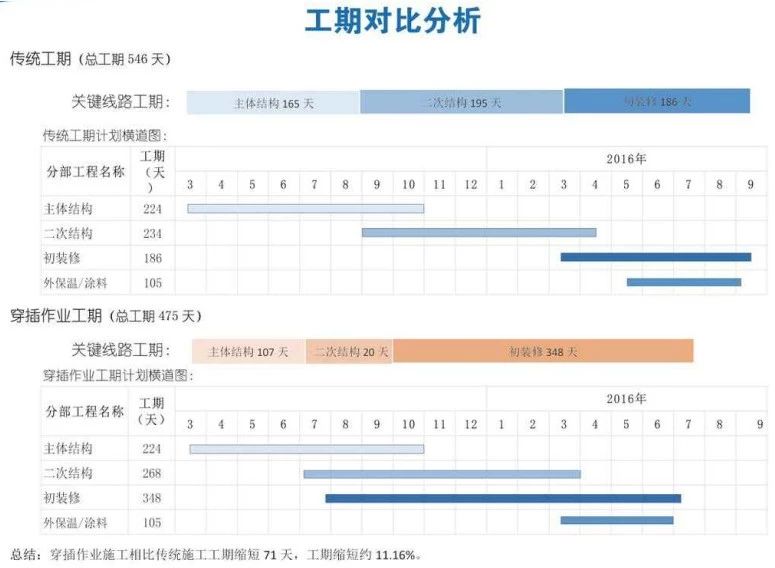 本工程案例住宅層高23、26層,推行大穿插作業(yè)施工相比傳統(tǒng)施工工期可縮短71天,工期縮短約11.16%。如果30層以上高層,工期縮短效果將更加明顯。
