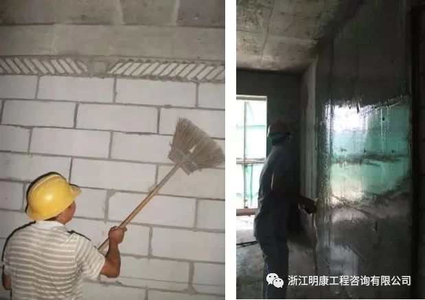 一般在抹灰前一天,用水管或噴壺順墻自上而下澆水濕潤。不同的墻體,不同的環境需要不同的澆水量。澆水要分次進行,最終以墻體既濕潤又不泌水為宜。