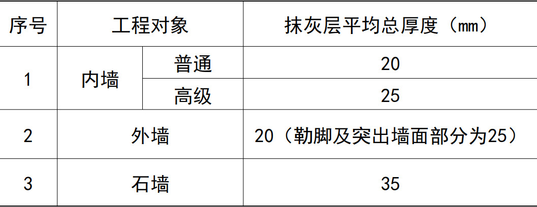 抹灰層的平均總厚度應符合設計要求。通常抹灰構造各層厚度宜為5~7mm,抹石灰砂漿和水泥混合砂漿時宜為7~9mm。當設計無要求時,抹灰層的平均總厚度不應大于下表的要求。