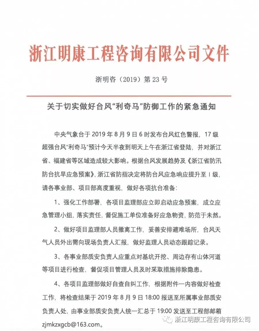 應(yīng)對(duì)臺(tái)風(fēng)王“利奇馬”的到來(lái),明康咨詢總部立即發(fā)出緊急通知: