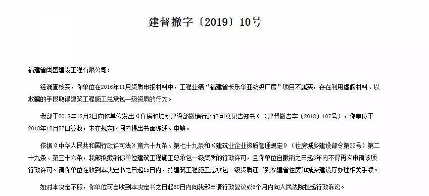 住建部擬撤銷此單位建筑工程施工總承包一級資質的行政許可,且自撤銷之日起3年內不得再次申請該項行政許可。