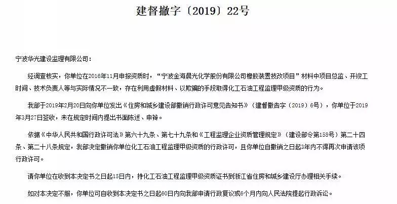 住建部決定撤銷此單位化工石油工程監理甲級資質的行政許可,且自撤銷之日起3年內不得再次申請該項行政許可。