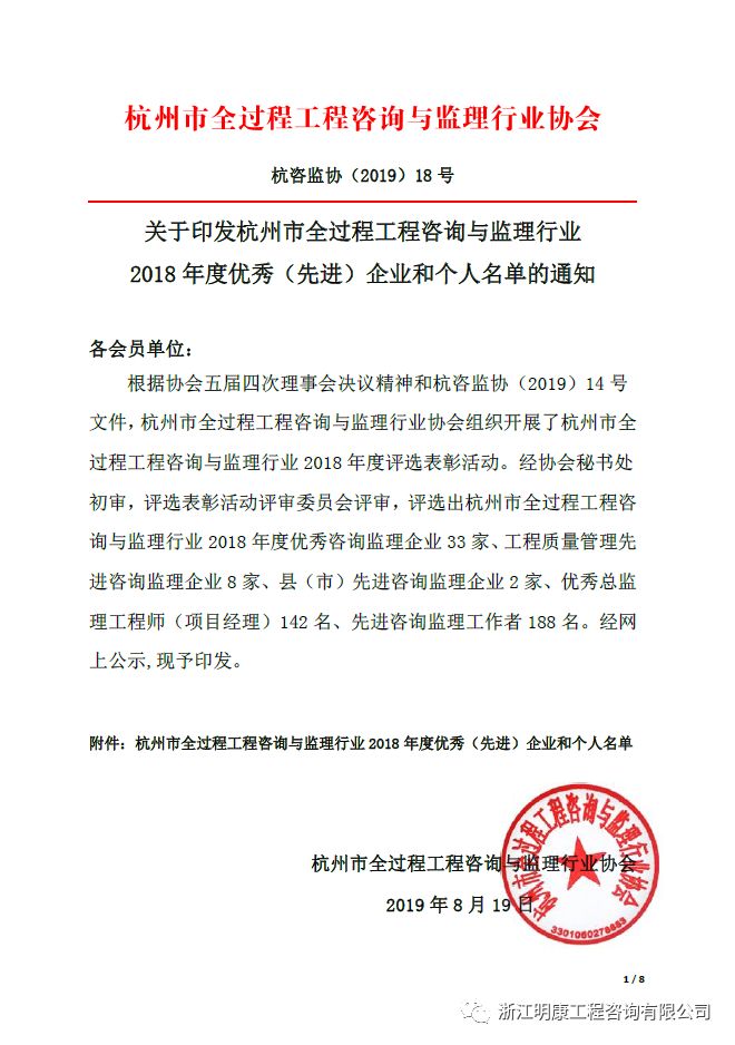 8月19日,杭州市全過程工程咨詢與監理行業協會發布《關于印發杭州市全過程工程咨詢與監理行業2018年度優秀(先進)企業和個人名單的通知》,其中獲評優秀咨詢監理企業33家、工程質量管理先進咨詢監理企業8家、縣(市)先進咨詢監理企業2家、優秀總監理工程師(項目經理)142名、先進咨詢監理工作者188名。