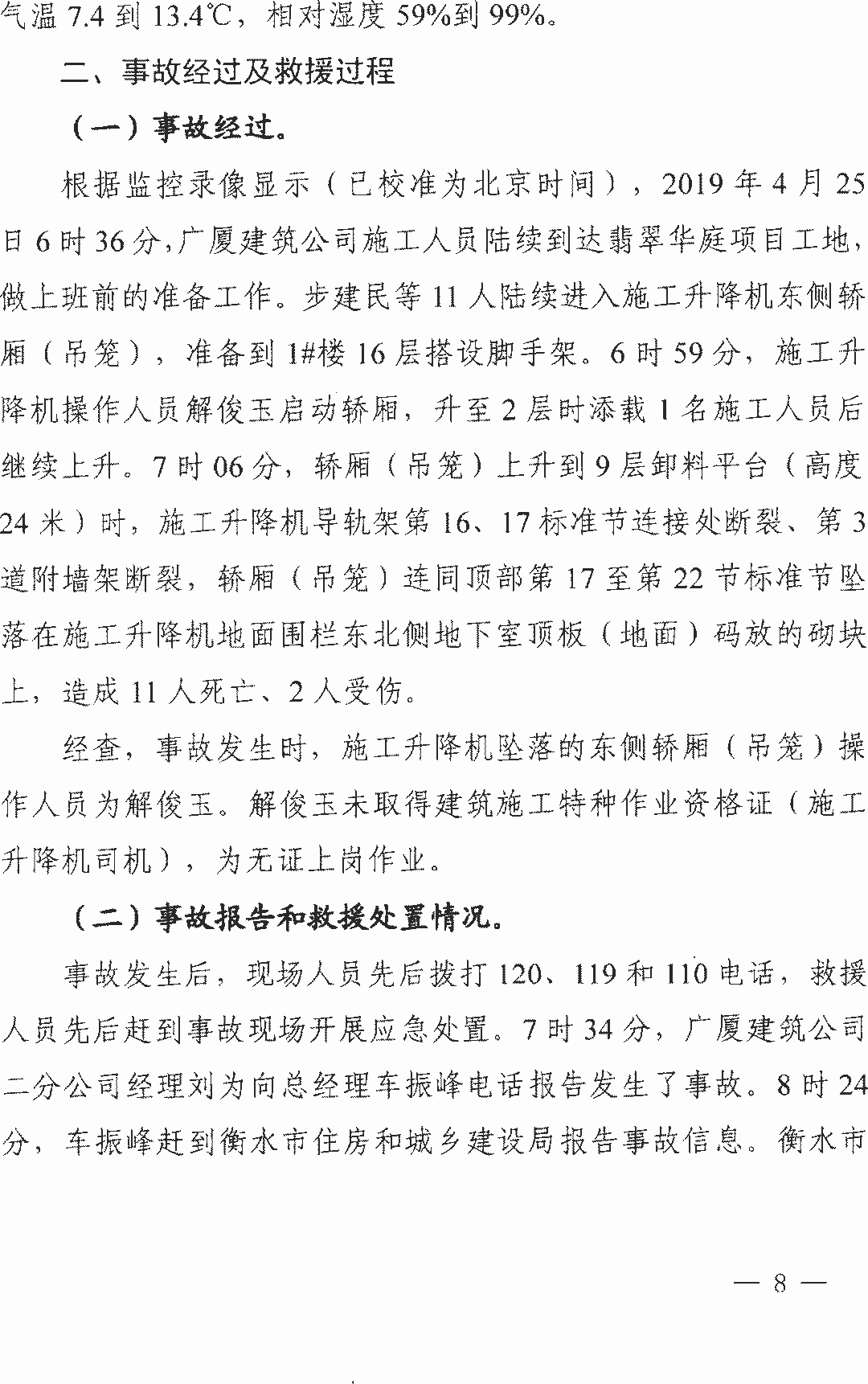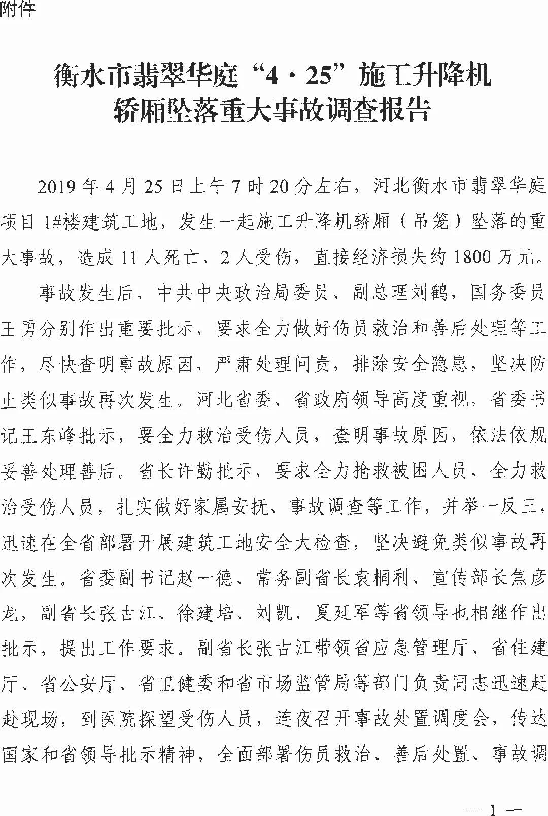 4月25日早晨八點,河北衡水市翡翠華庭工地施工升降梯折斷,造成施工人員11死2重傷。