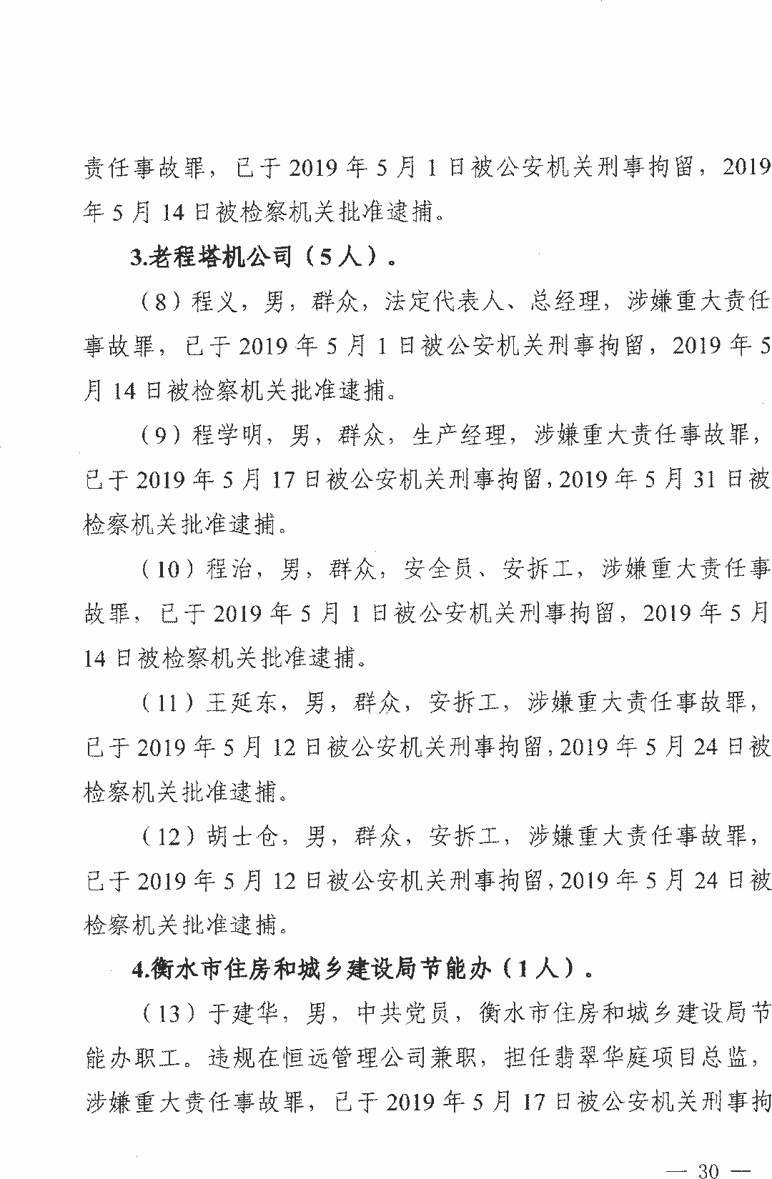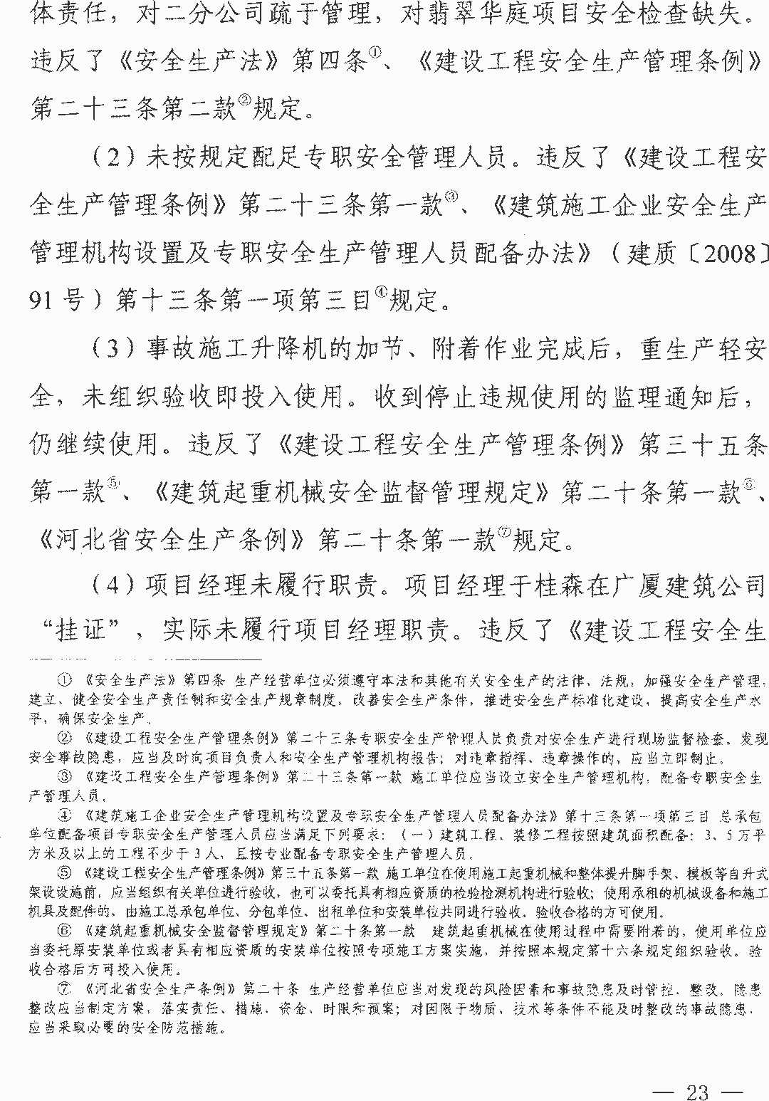于桂森,翡翠華庭項目經理,在衡水廣廈建筑公司“掛證”,建議吊銷執業資格證書、終身不予注冊,建議吊銷安全生產考核合格證書,已被檢察機關批準逮捕。