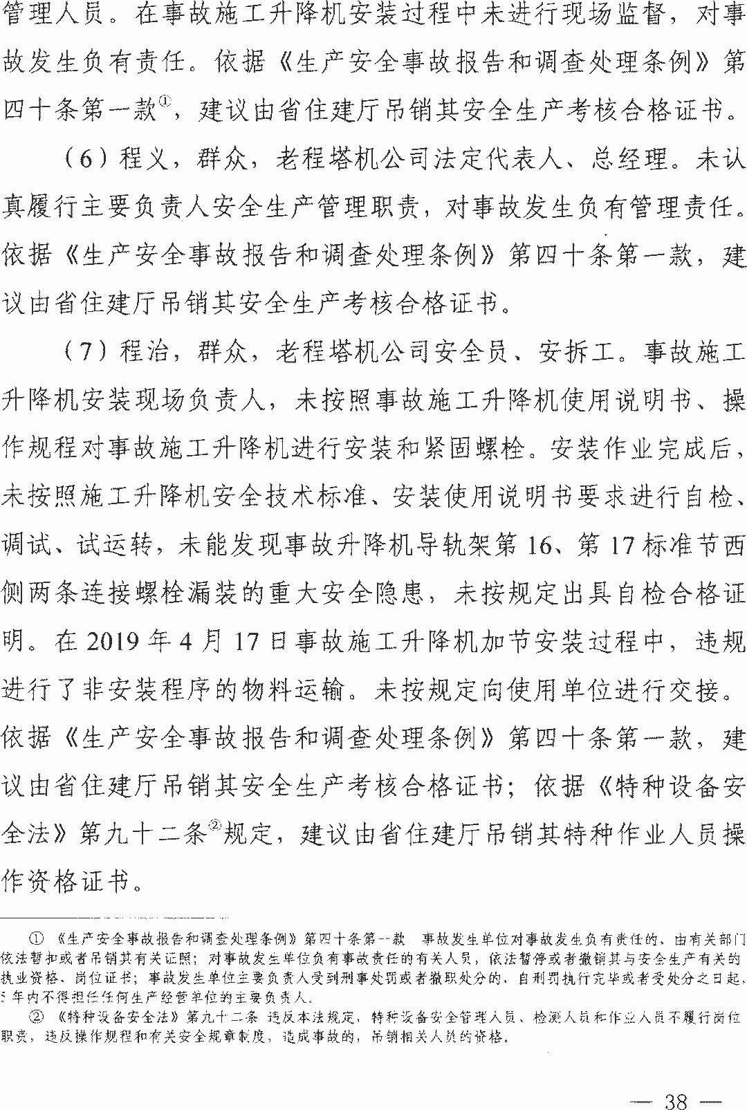 程治,安全員、安拆工,建議吊銷特種作業人員操作資格證書,已被檢察機關批準逮捕。