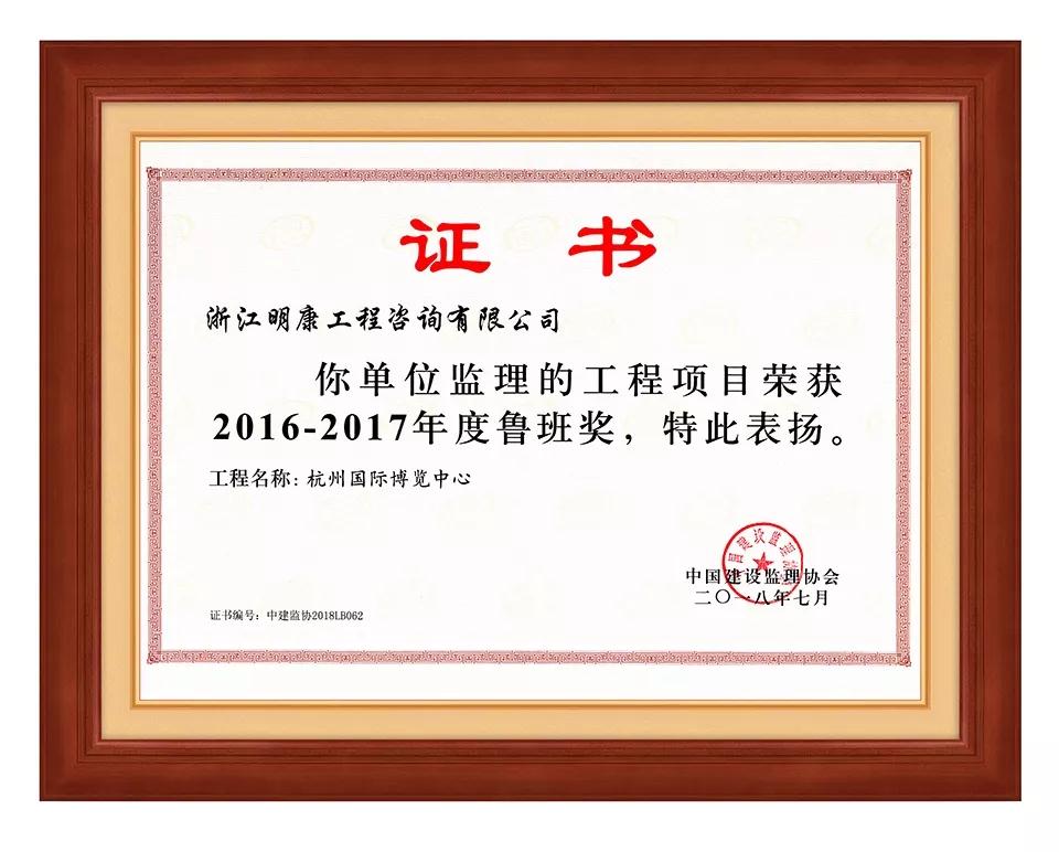 浙江明康工程咨詢有限公司監理的杭州國際博覽中心榮獲2016-2017年度中國建設工程魯班獎(國家優質工程),該獎項是中國建筑行業工程質量的最高榮譽,被稱為中國建筑界的“奧斯卡獎”。自1987年設立以來,魯班獎已走過30年的璀璨歷程,在業內和社會上都產生了重大影響,已成為精品工程和企業品牌的重要標志。