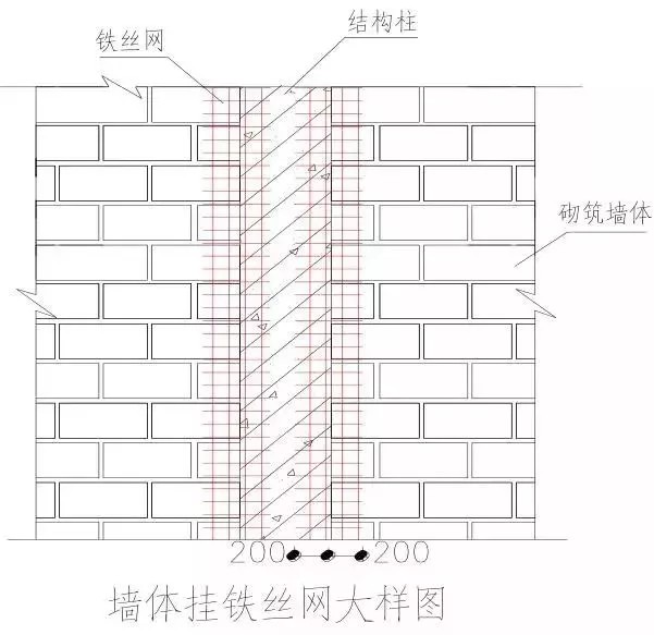 砌體砌筑完成后在砌體與混凝土接縫處掛鋼絲網,減輕砌體材料與混凝土結構之間因線脹系數而引起的抹灰層裂縫。