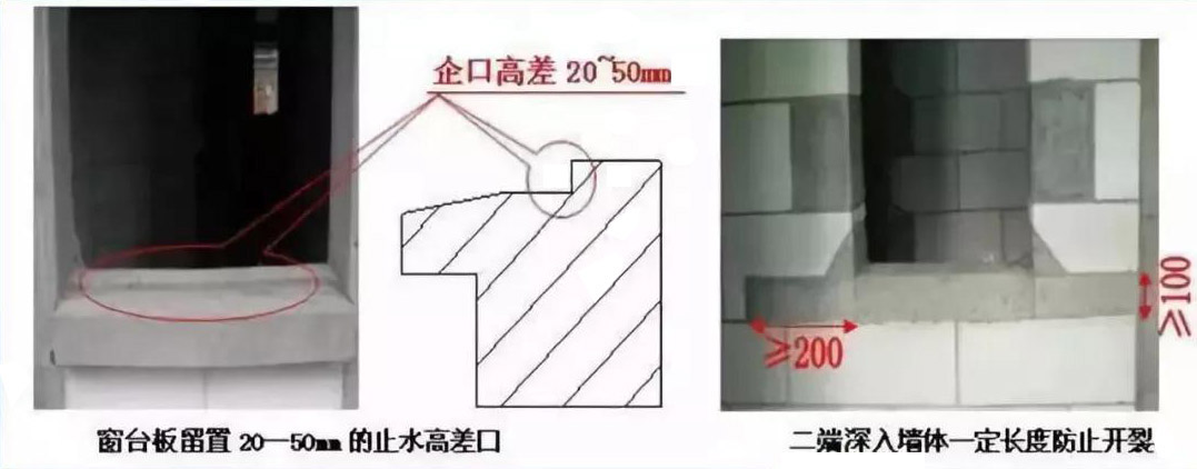 在二次結構施工時對窗臺梁進行優化設置企口,有效防治窗框周邊滲漏水。
