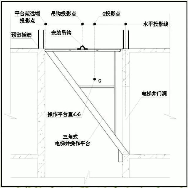 三角式操作平臺通過兩根工字鋼斜撐和支角緊貼電梯井內壁和梯井洞口梁,當平臺上增加荷載時形成自錨機制,安全可靠,同時平臺側部通過緊固件可頂住井壁,防止平臺側向傾斜。