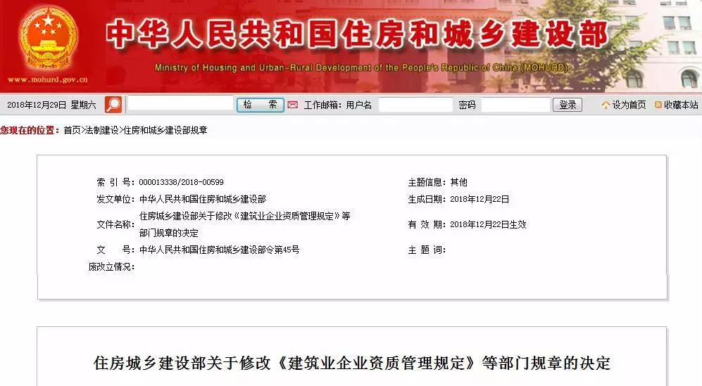 為貫徹落實國務院深化“放管服”改革,加快推進政務服務“一網通辦”的要求,住房城鄉建設部決定:一、將《建筑業企業資質管理規定》(住房城鄉建設部令第22號,根據住房城鄉建設部令第32號修正)第十四條修改為:“企業申請建筑業企業資質,在資質許可機關的網站或審批平臺提出申請事項,提交資金、專業技術人員、技術裝備和已完成業績等電子材料”。